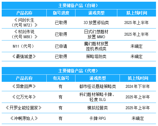 公司储备多款新品,,,期待为玩家解锁更多新鲜体验,,,,部分产品如下表所示::::