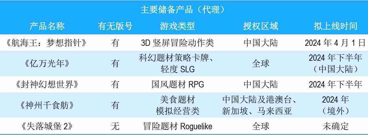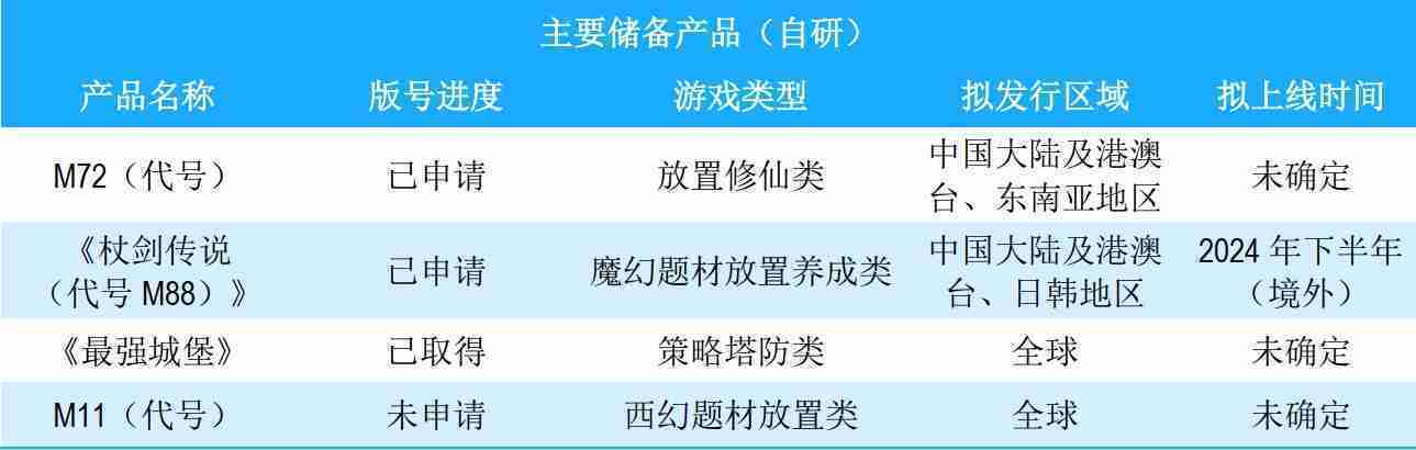 公司储备的多个自研、、、、代理产品都在有序推进当中,,,,涵盖放置类、、、策略类、、模拟经营类、、、RPG、、、、Roguelike等多元化游戏品类,,,,储备的主要自研和代理产品如下:::